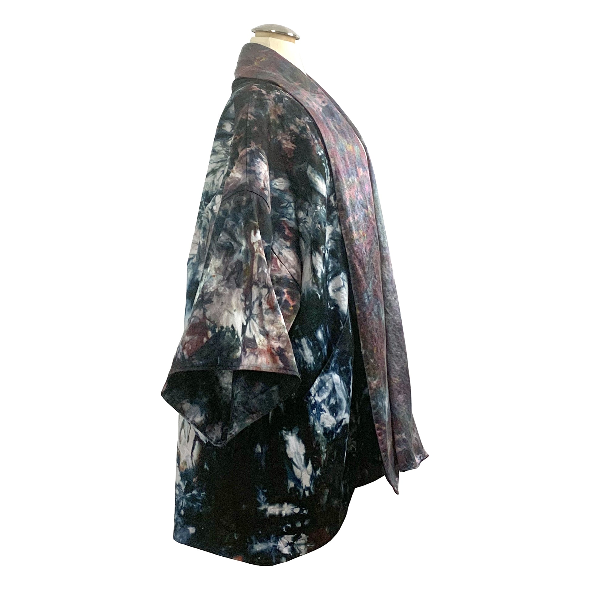 Oversized, fully lined jacket with generous pockets, back neck inverted box pleat, fluidly drapes like a dream. Hand dyed. One of a kind. Made to last through the seasons. Effortlessly pairs with jeans, trousers, dresses, skirts, you name it. Comfort + luxury at its finest.