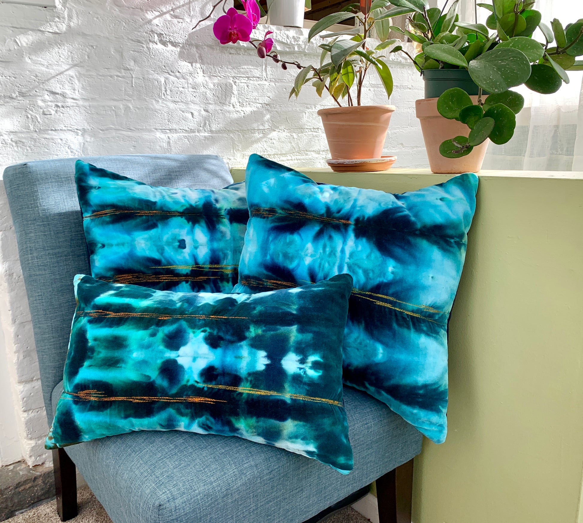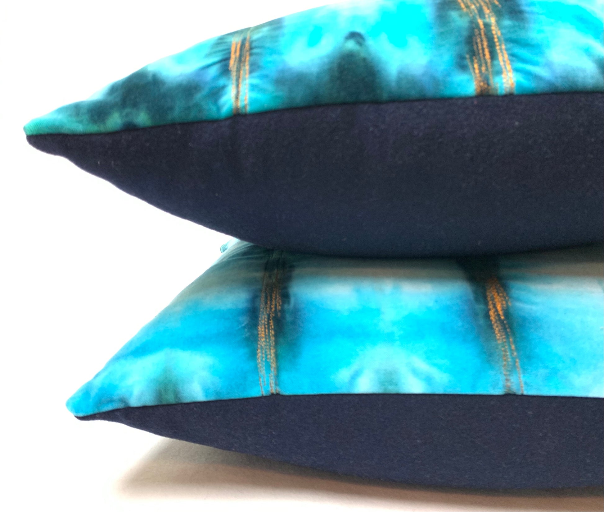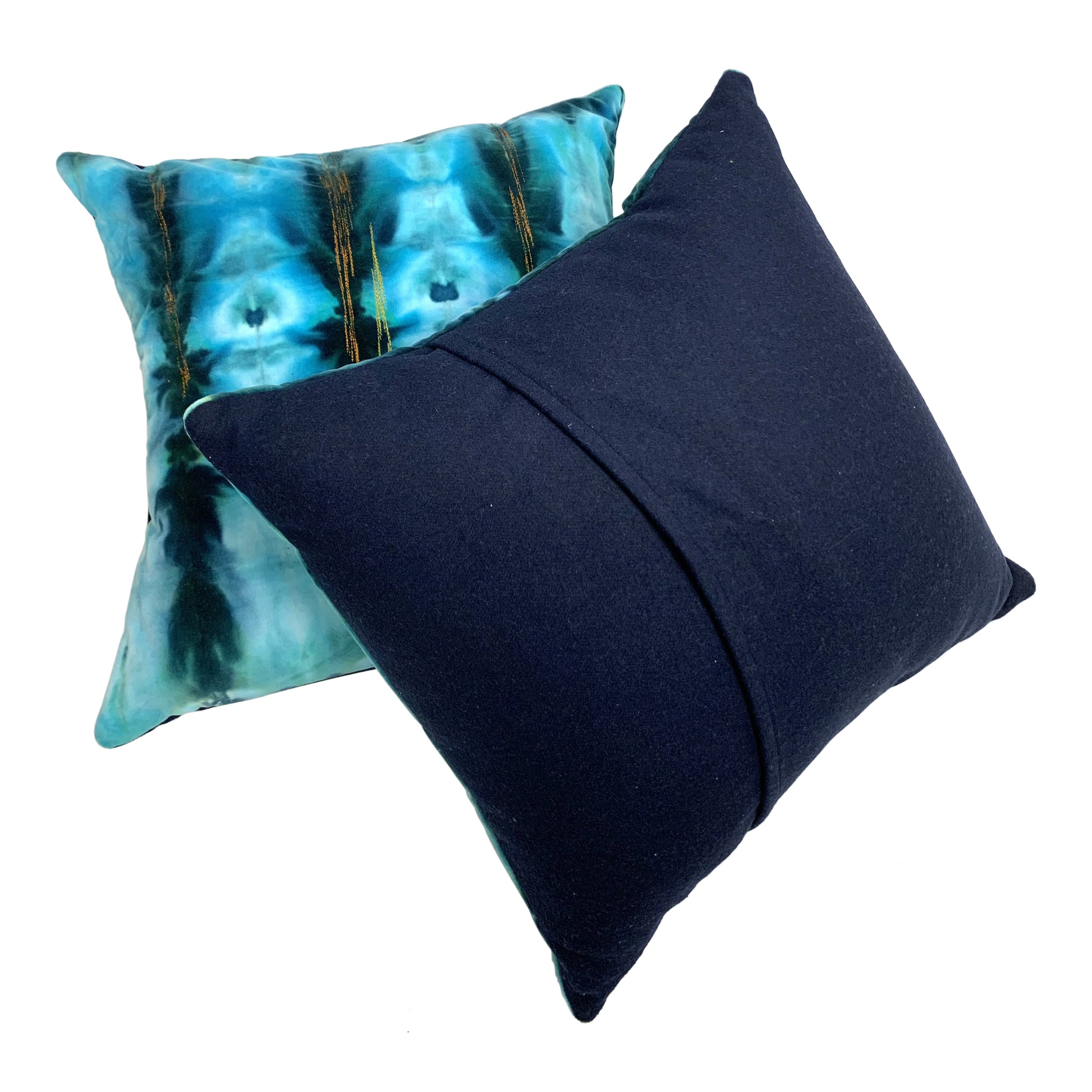 One of a kind art pillow. Hand dyed shades of teal, marine, and aqua in luxurious cotton velveteen. Free motion embroidery in gold rayon thread. Lined front, French seams. 100% cotton, 100% navy melton wool envelope back. Comes with the pillow form. Even more stunning in person. (2) 20x20, and (1) 14x22 lumbar. Each slightly different.