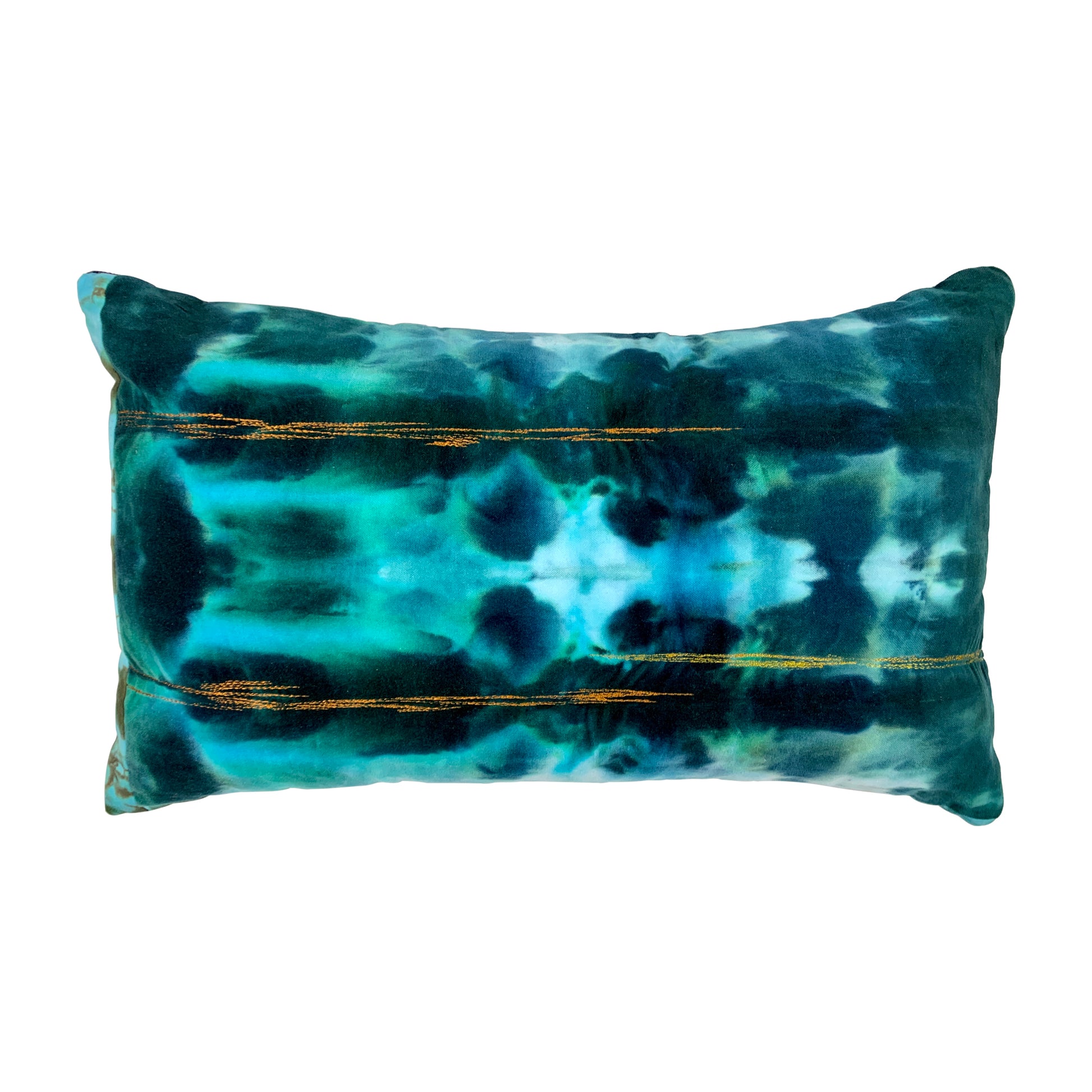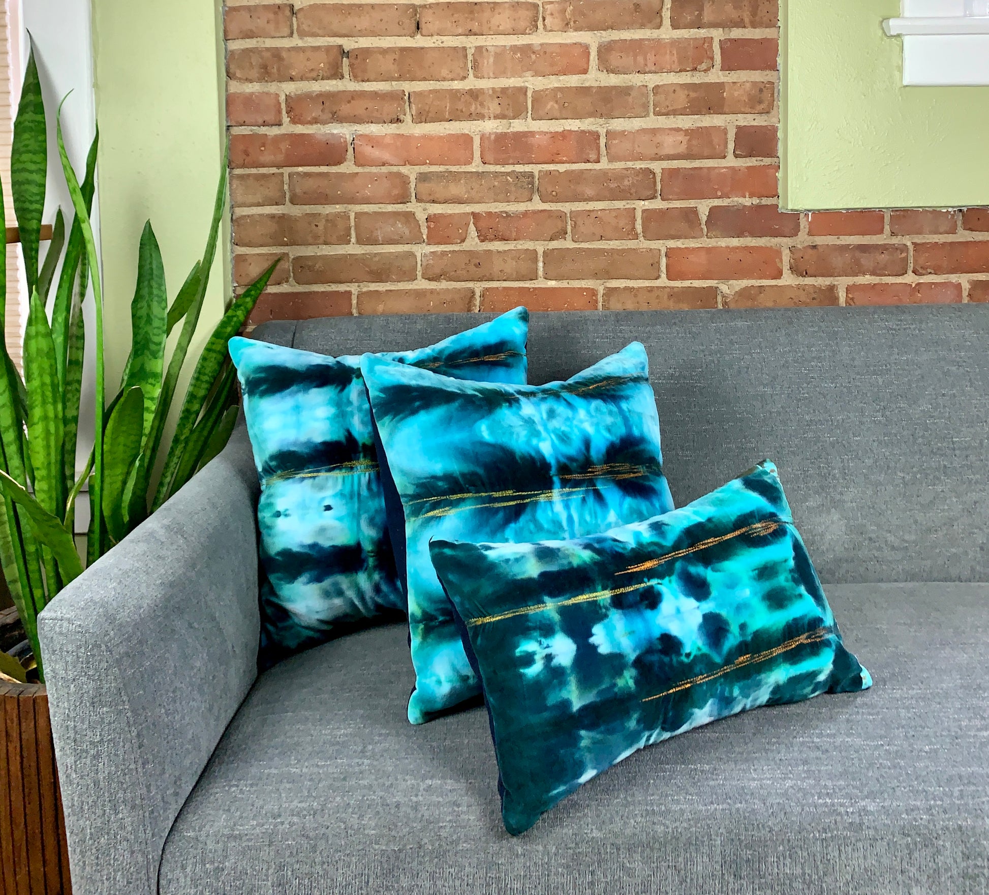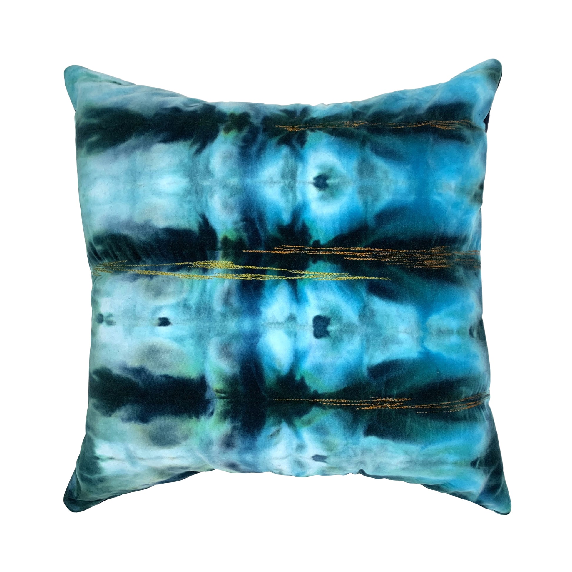 One of a kind art pillow. Hand dyed shades of teal, marine, and aqua in luxurious cotton velveteen. Free motion embroidery in gold rayon thread. Lined front, French seams. 100% cotton, 100% navy melton wool envelope back. Comes with the pillow form. Even more stunning in person. (2) 20x20, and (1) 14x22 lumbar. Each slightly different.